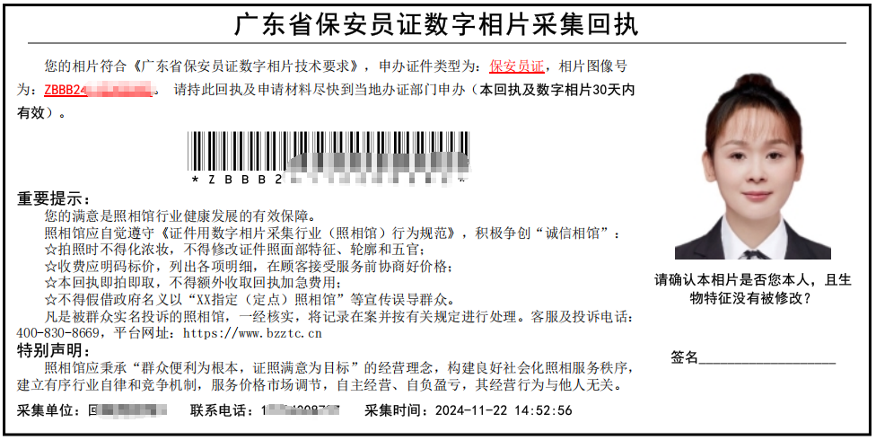 :回执关联了个人姓名、身份证号等信息,是公安机关审核从业资格时,确认 “照片与本人一致” 的关键依据,无回执将无法提交办证申请。 确保照片合规
