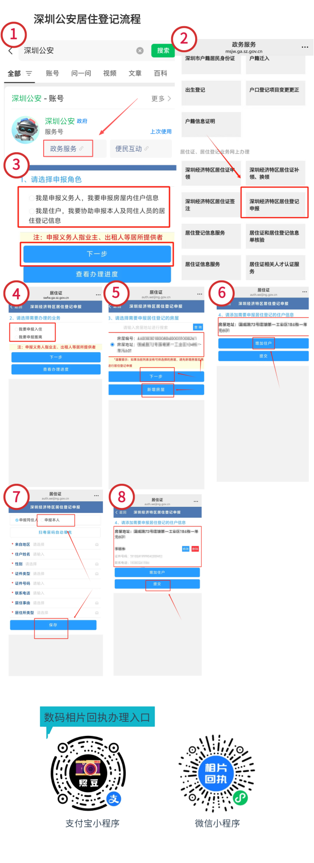 (图示核心步骤:1. 打开 “深圳公安” 小程序 → 2. 进入 “居住证、居住登记业务网上办理” → 3. 选择 “深圳经济特区居住登记申报” → 4. 按提示选择申报角色(申报义务人 / 住户) → 5. 搜索并选择房屋地址 → 6. 填写住户信息(姓名、证件号、居住事由等) → 7. 提交信息等待审核)