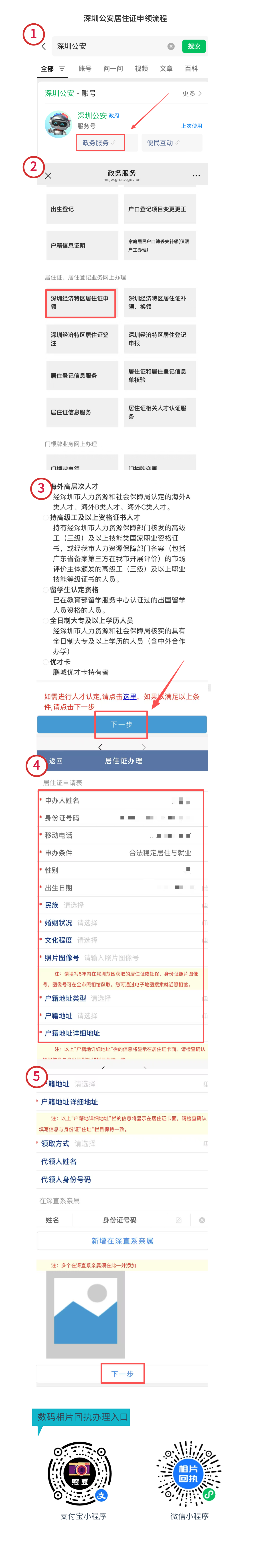 (图示核心步骤:1. 打开 “深圳公安” 小程序 → 2. 进入 “深圳经济特区居住证申请” → 3. 选择对应申领条件(如 “全日制大专及以上学历人员”“合法稳定居住与就业” 等) → 4. 填写《居住证申请表》(含个人信息、照片图像号、户籍地址等,户籍地址需与身份证一致) → 5. 选择领取方式(自取 / 代领) → 6. 上传材料并提交申请)