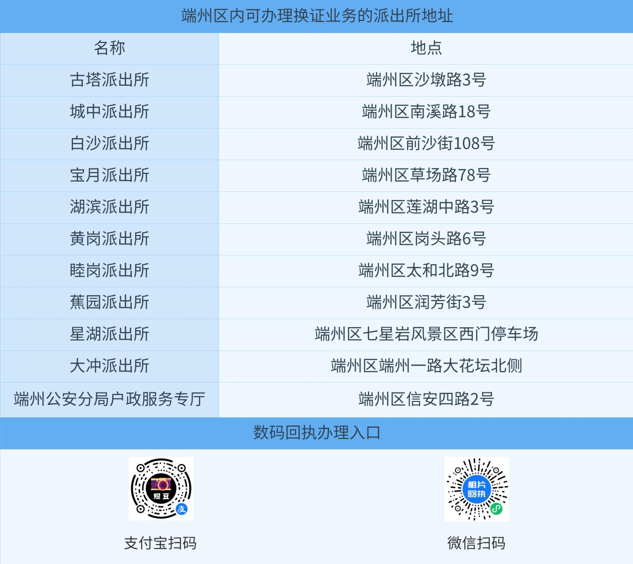 携带材料前往线下窗口办理即可,端州区办理地点见图 3 端州区内可办理换证业务的派出所地址。