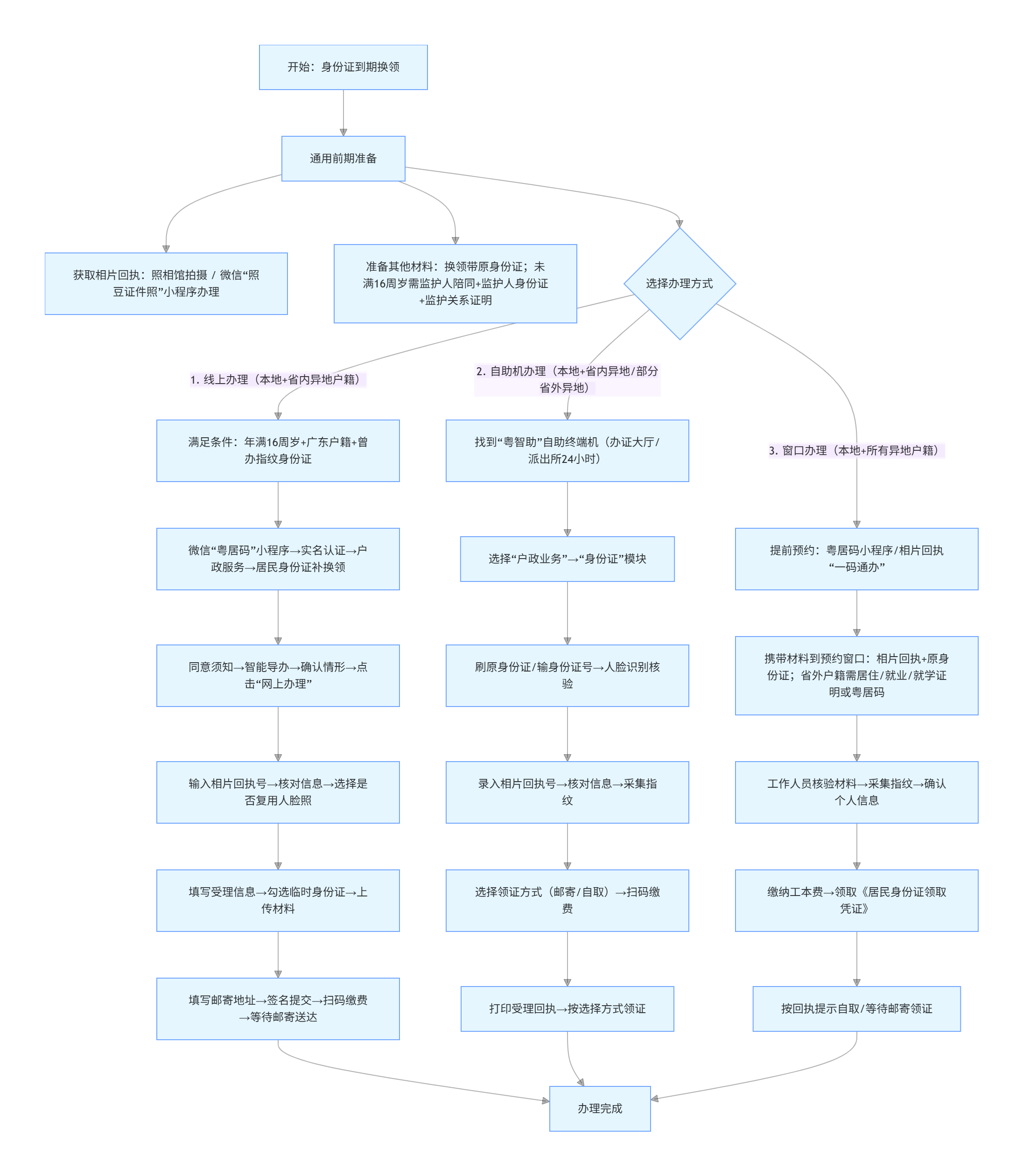 清远身份证到期换证的线上、自助、窗口三种方式,对本地和异地户籍居民的适用范围略有差异,核心材料均需准备广东省居民身份证数字相片采集回执与原身份证,以下是详细攻略: